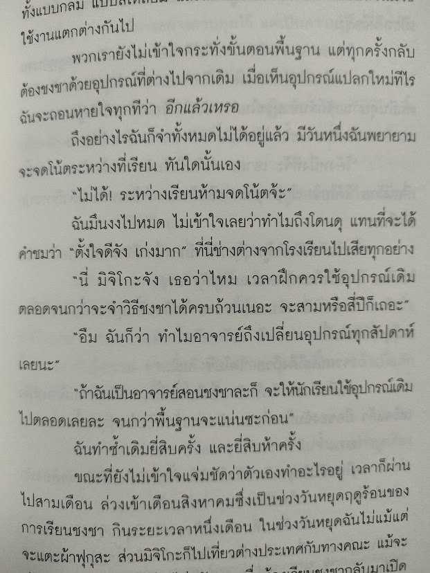 การเรียนชงชานั้นเหมือนพิธีกรรมอะไรสักอย่าง มีข้อกำหนดเยอะมาก ต้องพับผ้าแบบนี้ เช็ดกระปุกชาเป็นตัวอักษรญี่ปุ่น ต้องก้าวเท้าซ้ายก่อน ต้องเดินเป็นจำนวนก้าวเท่านี้ระหว่างเสื่อทาทามิ เวลาตักน้ำต้องตักจากก้นหม้อ ตักจากกลางหม้อ ยกกระบวยความสูงต้องเท่านี้ เอียงองศาประมาณนี้ เยอะแยะไปหมด โมริชิตะรู้สึกขัดแย้งในใจเพราะเวลาเรียนที่โรงเรียนครูมักสนับสนุนให้ถาม แต่พอมาเรียนที่นี่กลับห้าม ไม่รู้ว่าแต่ละอย่างที่ทำไปทำเพื่ออะไร